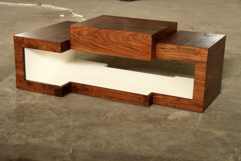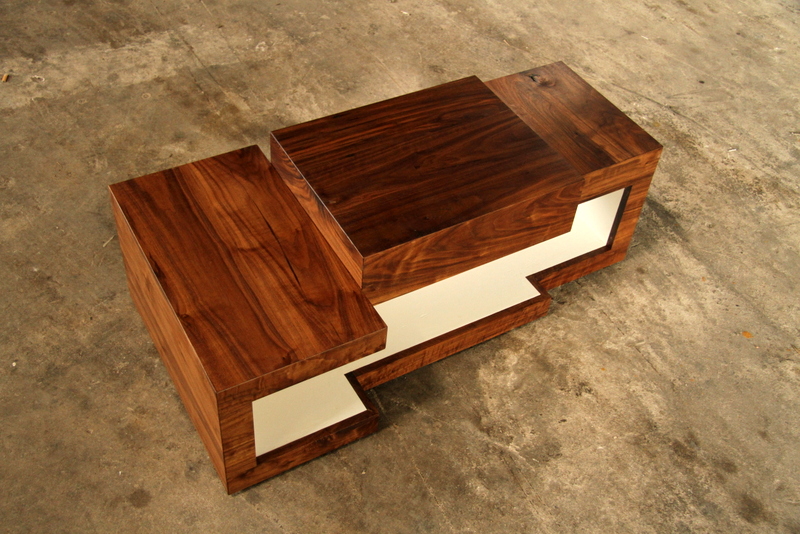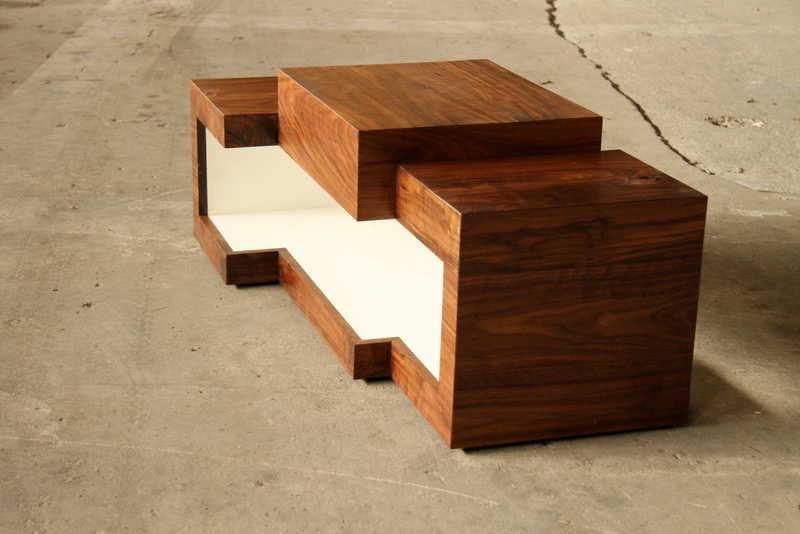 TV MEUBELDit TV meubel bestaat uit drie blokken van verschillende afmetingen. De drie afzonderlijke blokken worden verbonden door de binnenkant van het meubel, die als het ware een hap neemt uit alle drie de blokken. Deze verbondenheid wordt versterkt door het sterke contrast tussen de buitenkant van donker notenhout en de wit gelakte binnenkant. |