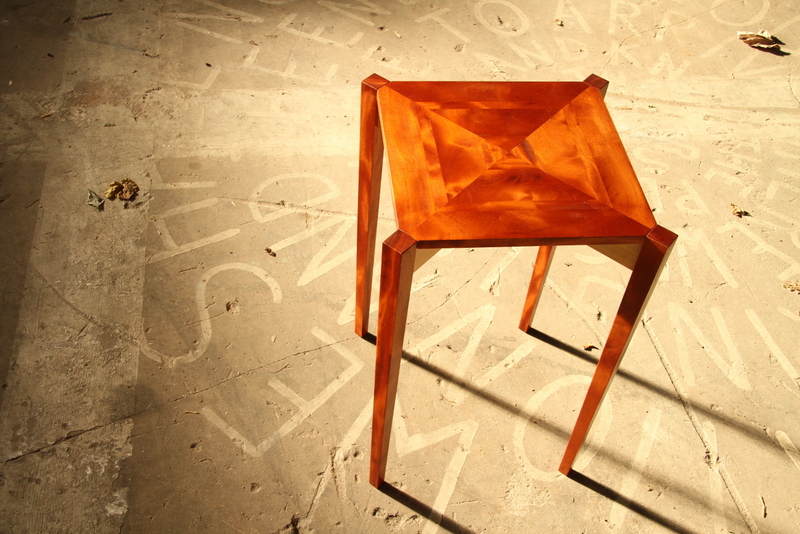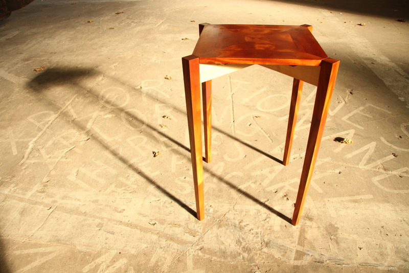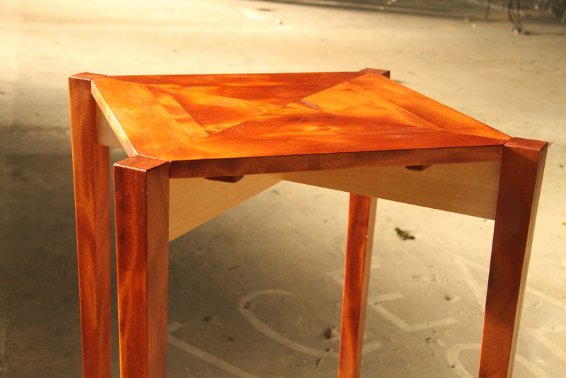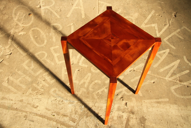 Deze zeer bijzondere bijzettafel is gemaakt van mahonie en esdoorn.
