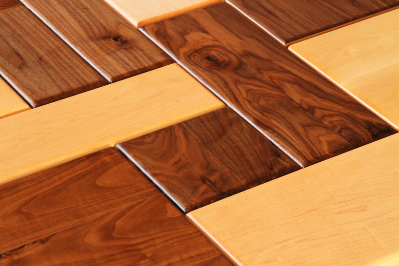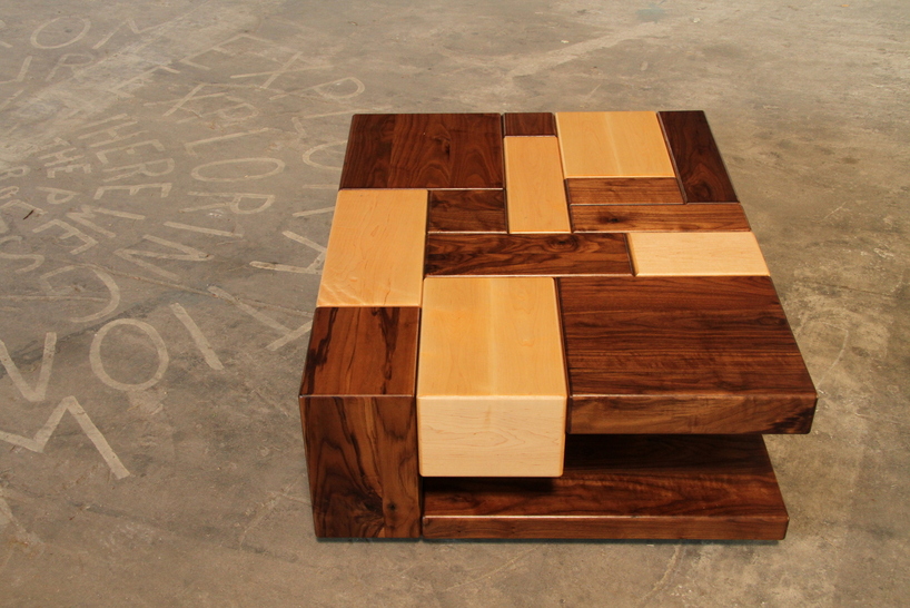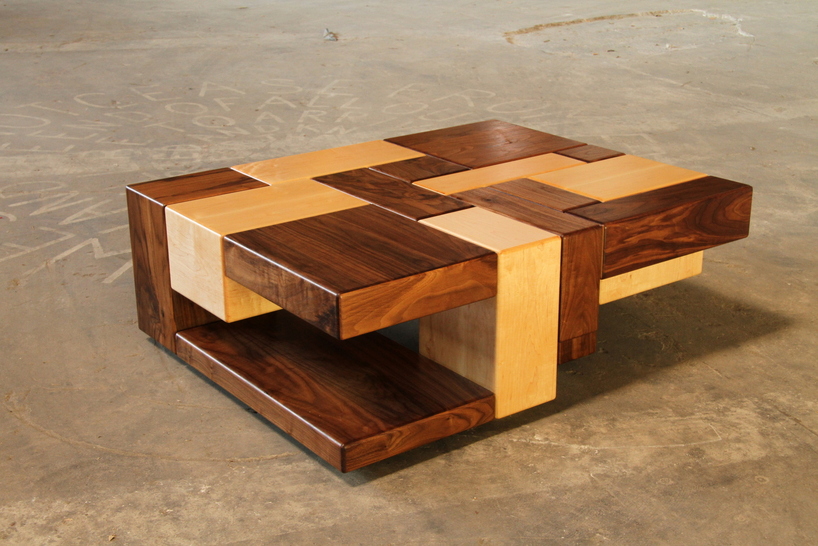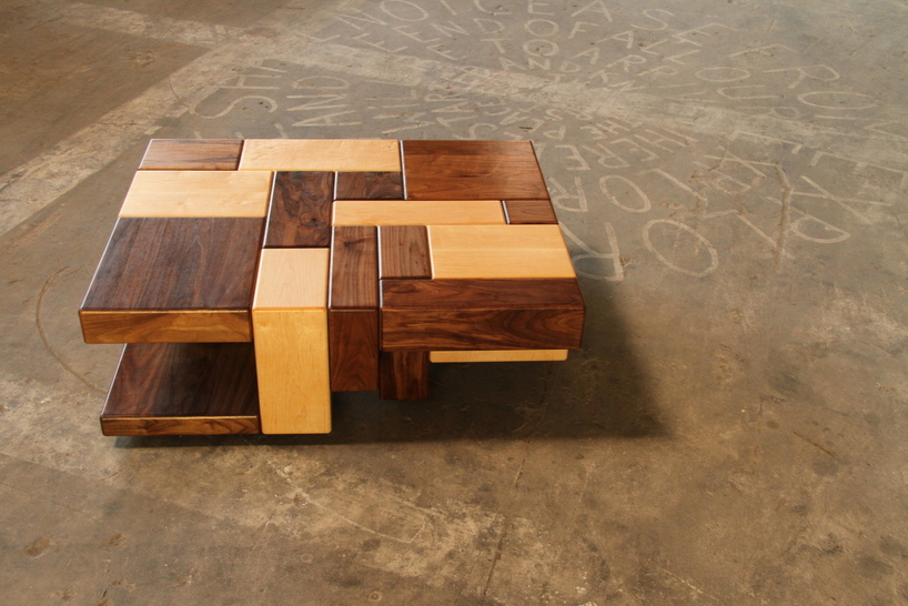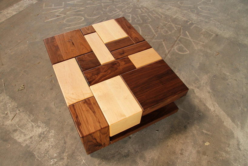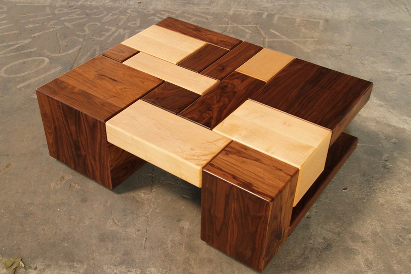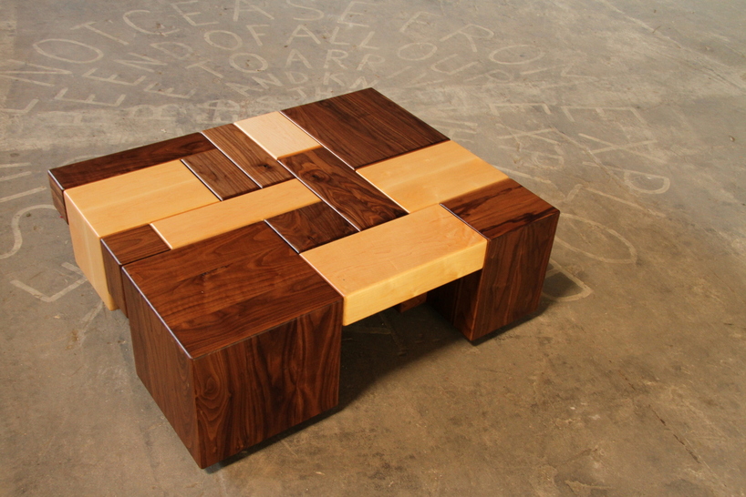 SALONTAFELDeze salontafel is gemaakt als huwelijksgeschenk. De tafel bestaat uit 15 holle blokken hout, die allemaal verschillend zijn in formaat. Twee houtsoorten worden gebruikt: het donkere notenhout dat een mooie houttekening heeft en het lichtgele esdoorn, dat een veel neutralere uitstraling heeft. Tezamen geven deze houtsoorten en de verschillende blokken een uniek karakter aan deze tafel. Dit wordt versterkt door de afronding van alle hoeken, die de afzonderlijke blokken benadrukt. |