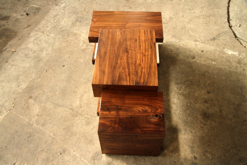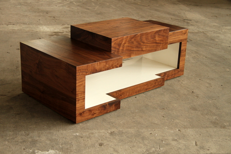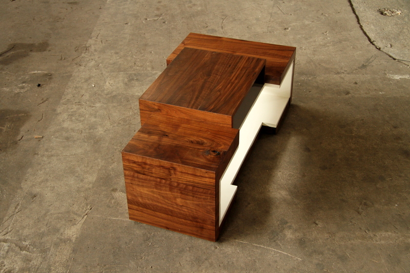 TV MEUBELDit TV meubel bestaat uit drie blokken van verschillende afmetingen. De drie afzonderlijke blokken worden verbonden door de binnenkant van het meubel, die als het ware een hap neemt uit alle drie de blokken. Deze verbondenheid wordt versterkt door het sterke contrast tussen de buitenkant van donker notenhout en de wit gelakte binnenkant. |